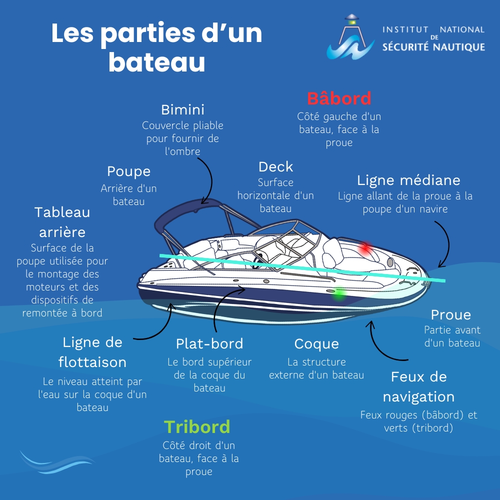 • Les plaisanciers au Canada doivent connaître les termes nautiques corrects désignant les différentes parties d’un bateau afin de pouvoir respecter les consignes de sécurité et de navigation.