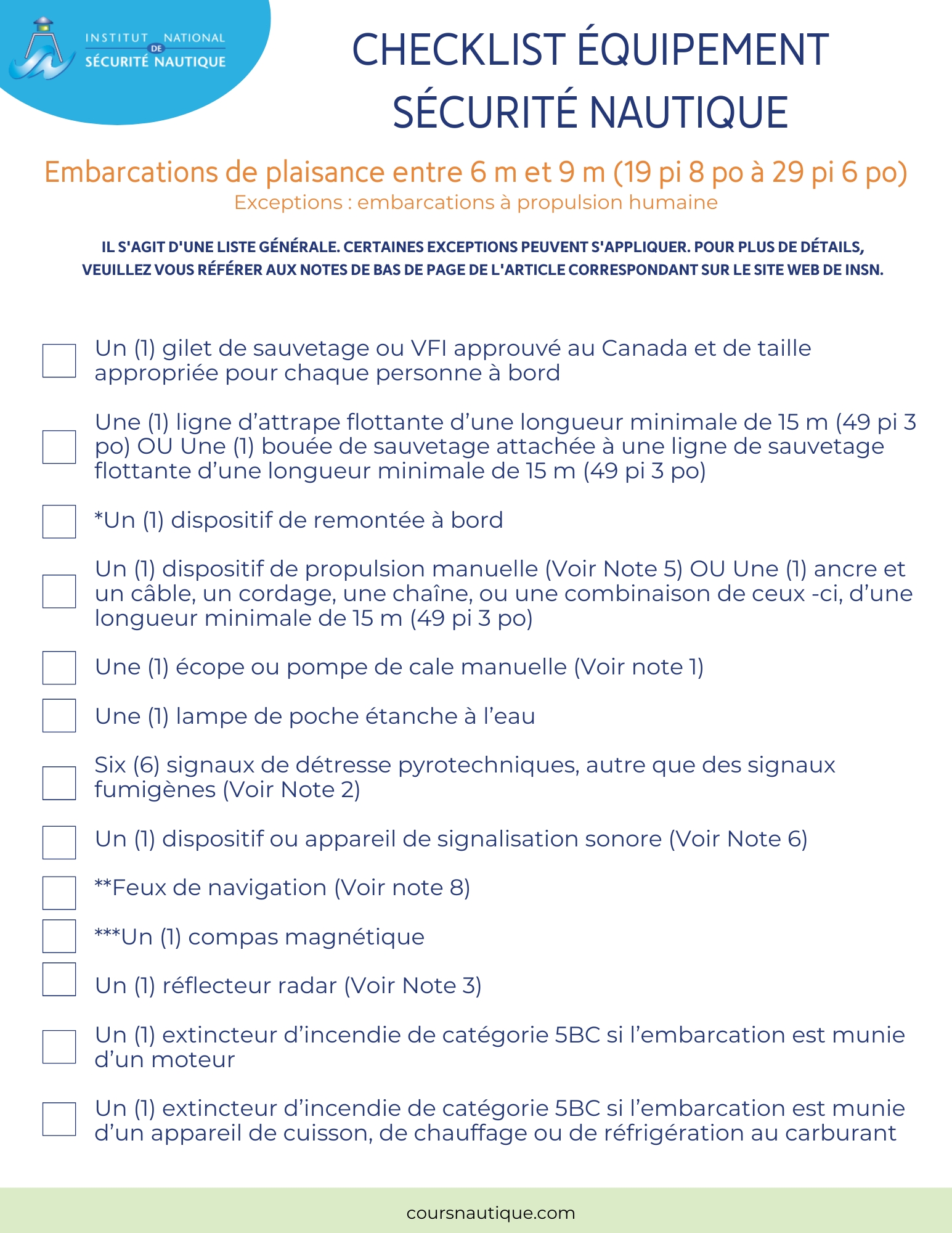 Note 8. Les embarcations à propulsion humaine et les voiliers mesurant moins de 7 m (23 pi 4 po) peuvent rencontrer cette obligation en ayant à bord une lampe de poche étanche à l’eau.