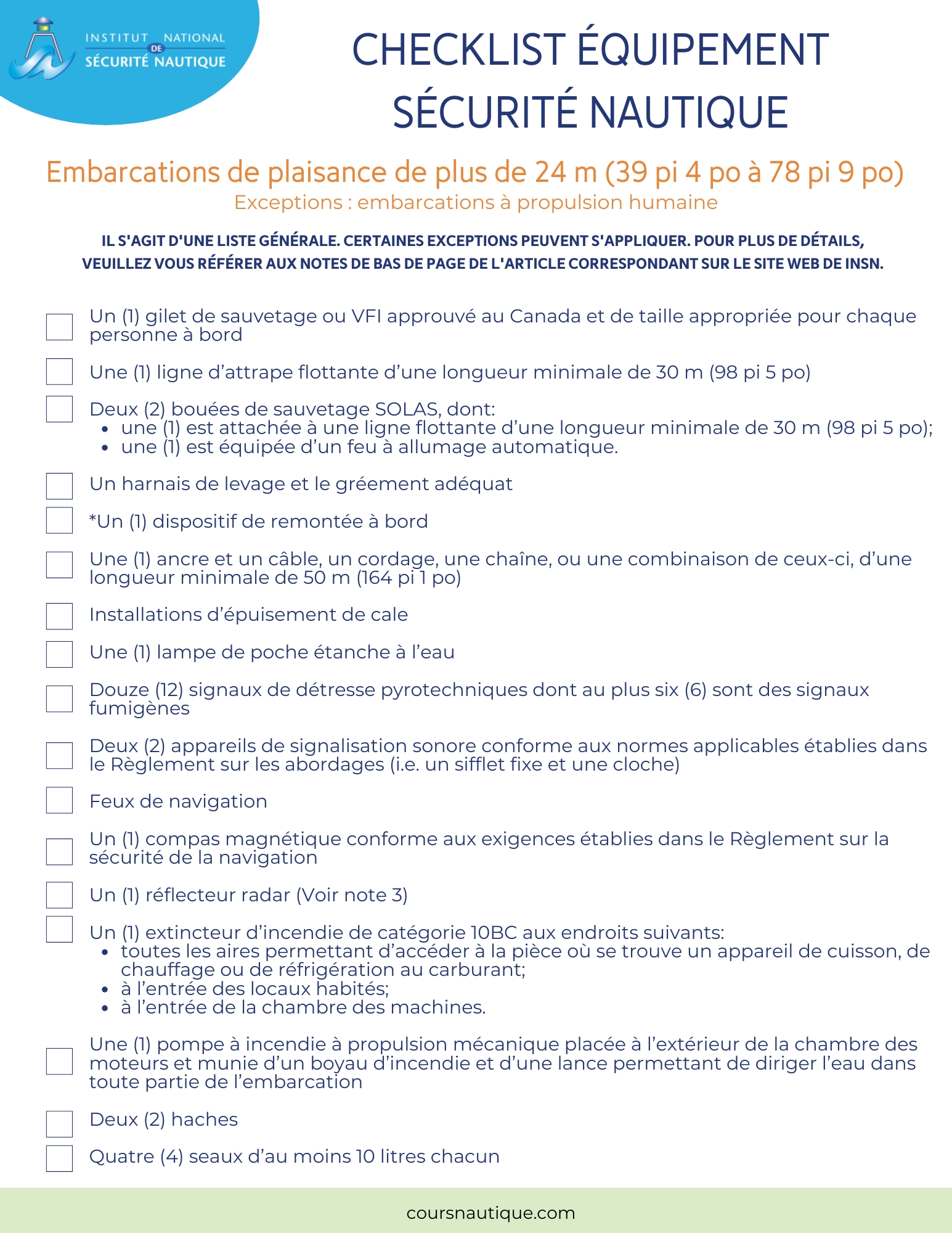 Pour les bateaux à propulsion humaine, l’équipement de sécurité est toujours obligatoire en vertu de la loi canadienne. Les exigences spécifiques en matière d’équipement dépendent de la longueur du bateau. Pour plus de détails, consultez la liste complète des équipements de sécurité nautique.